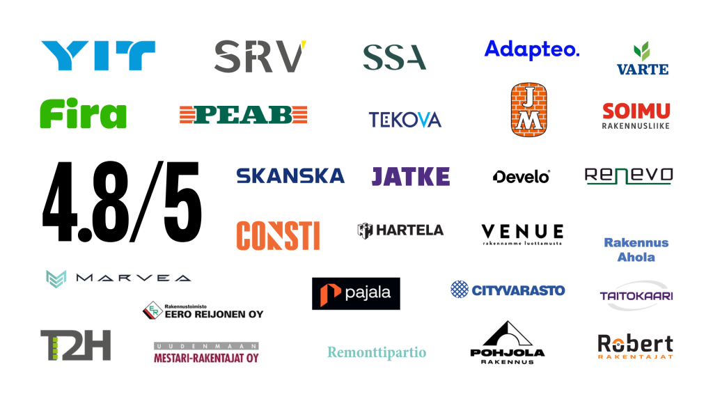 Palveluihimme luottaa jo lähes kaikki suuret rakennusliikkeet Suomessa. Asiakkaidemme antama pisteytys on 4.8/5 ja se onkin suurin kilpailuvalttimme.